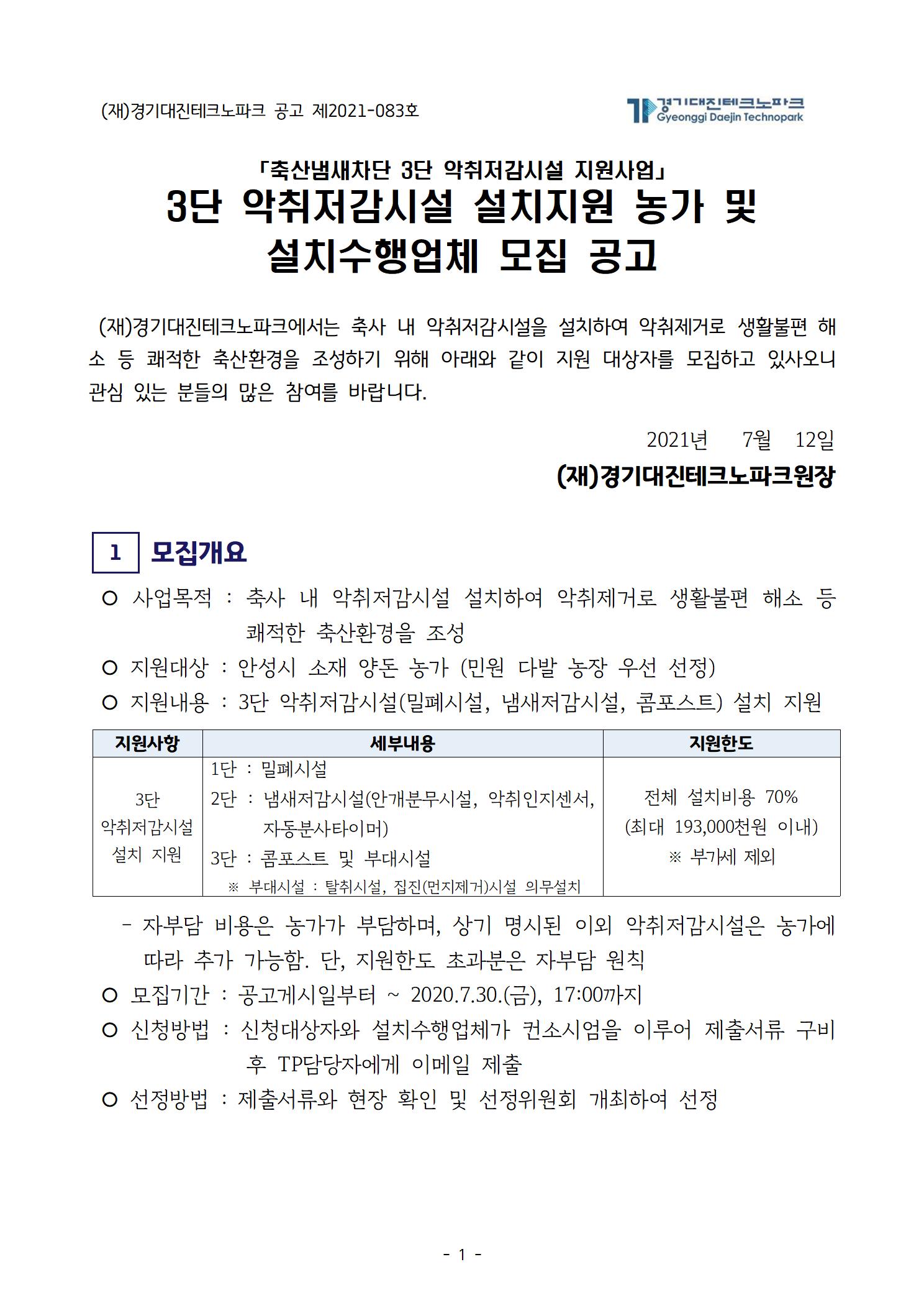 사업공고 축산냄새차단 3단 악취저감시설 지원사업 농가 및 설치수행업체 모집 공고 경기대진TP 21-07-12 2,059 Print 공고일 2021-07-12 ~ 2021-07-30 공고상태 마감 검색목록 이전글 다음글 목록