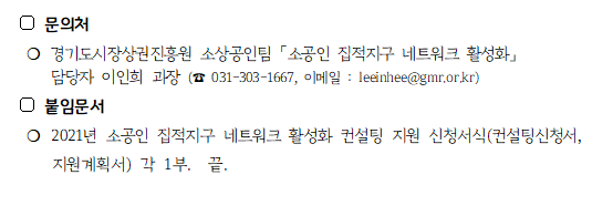 사업공고 2021년 「소공인 집적지구 네트워크 활성화」 컨설팅 지원 모집공고 경기대진TP 21-10-15 2,211 Print 공고일 2021-10-01 ~ 2021-12-31 공고상태 마감 검색목록 이전글 다음글 목록