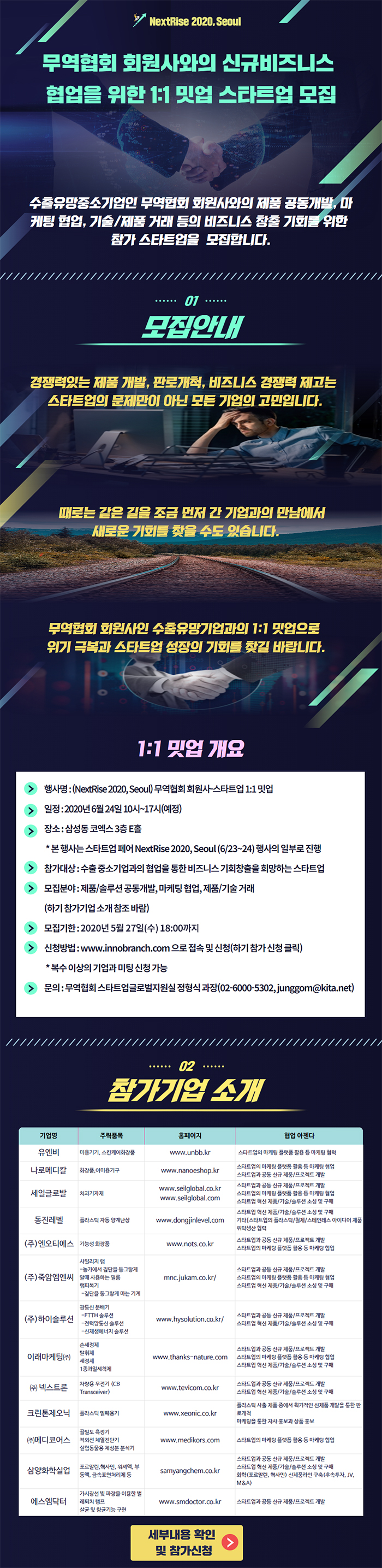 타기관공고 한국무역협회 회원사와의 신규비즈니스 협업을 위한 1:1 밋업 스타트업 모집 경기대진TP 20-05-20 35 Print < 세부내용 확인 및 참가신청 > https://innobranch.com/challenge/view.do?idx=55&sort=all&pageIndex=1 이전글 다음글 목록