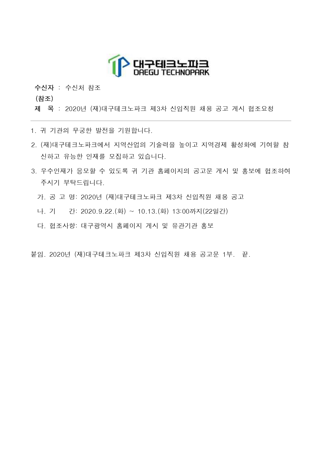 2020 (재)대구테크노파크 제3차 신입직원 채용 공고