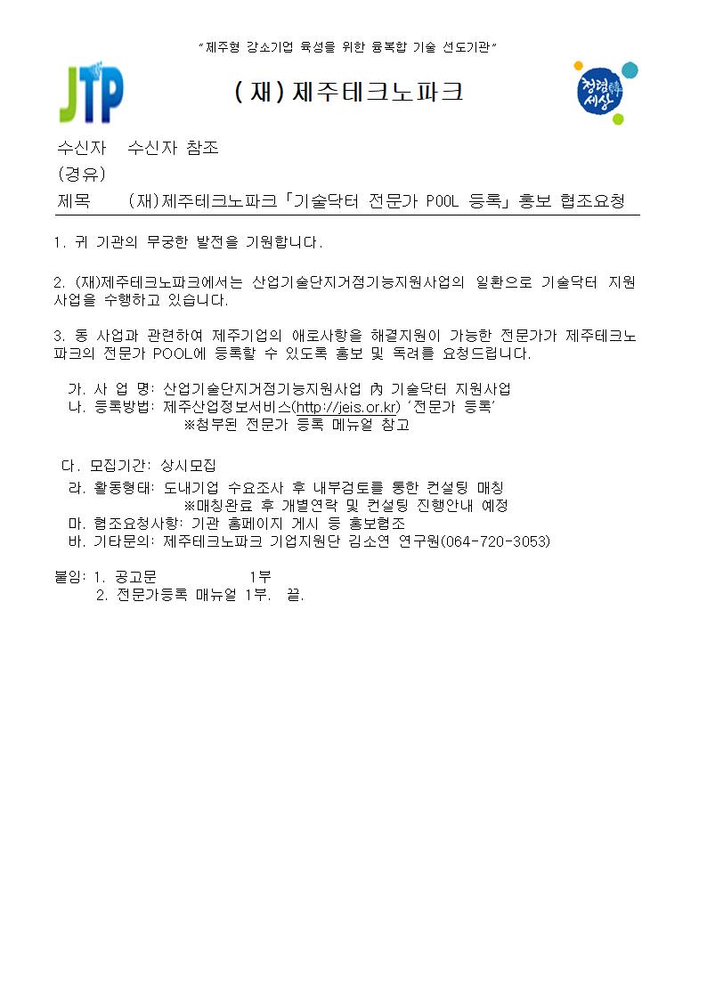 타기관공고 제주테크노파크 「기술닥터 전문가 POOL 등록」 경기대진TP 20-10-15 14 Print ※자세한 내용과 전문가등록 메뉴얼은 첨부파일을 확인해주세요. 이전글 다음글 목록