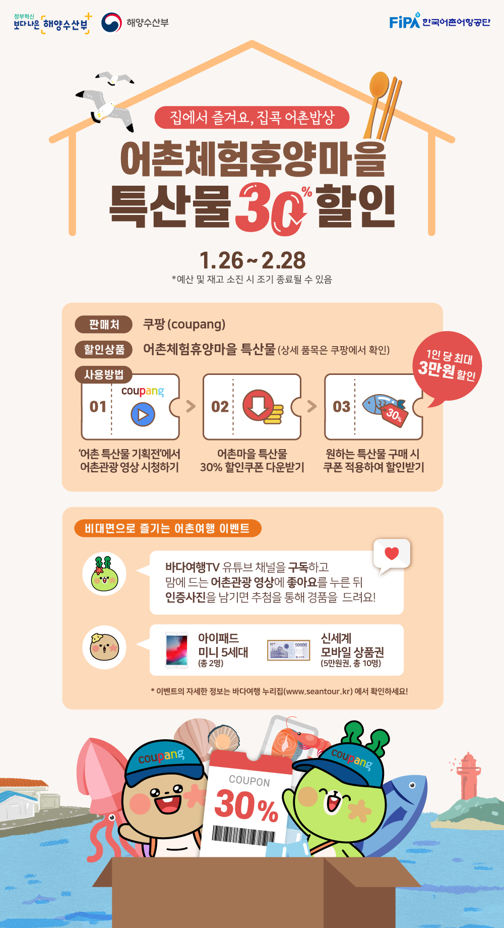 해양수산부와 산하 공공기관인 한국어촌어항공단에서‘쿠팡과 함께하는 어촌체험휴양마을 특산물 30% 할인행사’를 진행하고 있습니다.
