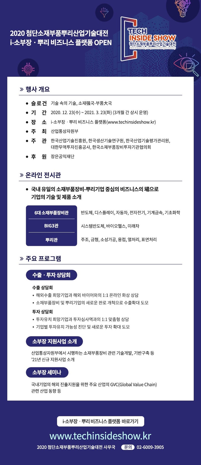 상기와 관련하여, 국내 기업을 위한 2020 첨단소재부품뿌리산업기술대전이 아래와 같이 진행되고 있으니 많은 기업의 참여 부탁드립니다