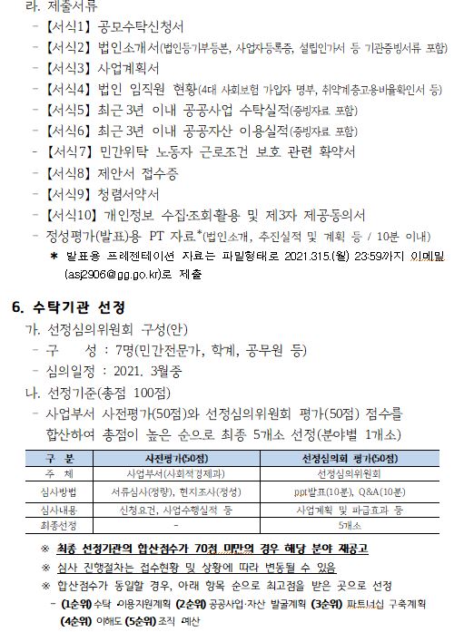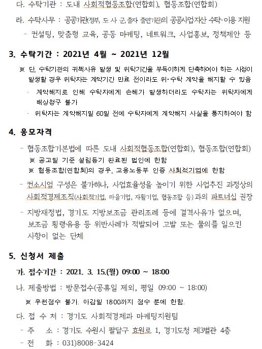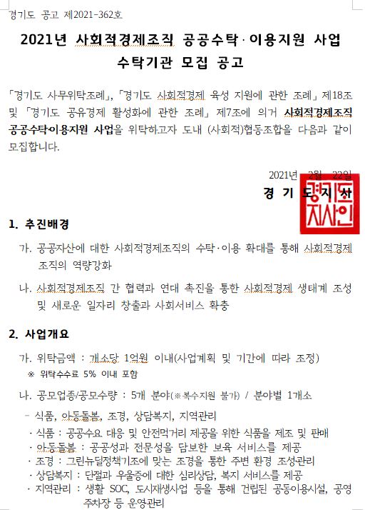 타기관공고 2021년 사회적 경제조직 공공수탁·이용지원 사업 수탁기관 모집공고 경기대진TP 21-02-23 14 Print * 공모사업과 관련된 자세한 자료는 경기도청 홈페이지에서 확인하시기 바랍니다. 이전글 다음글 목록