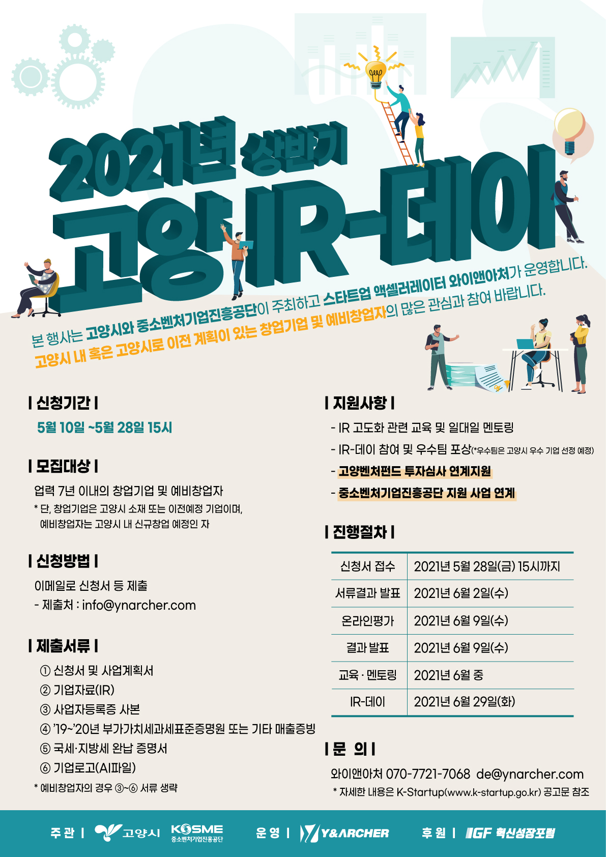 고양시와 중소벤처기업진흥공단이 주최하고 전문 액셀러레이터 와이앤아처(주)가 운영하는 『2021년 고양 IR-데이』에 참여할 창업기업 및 예비창업자를 다음과 같이 모집하오니, 많은 관심과 참여 바랍니다.