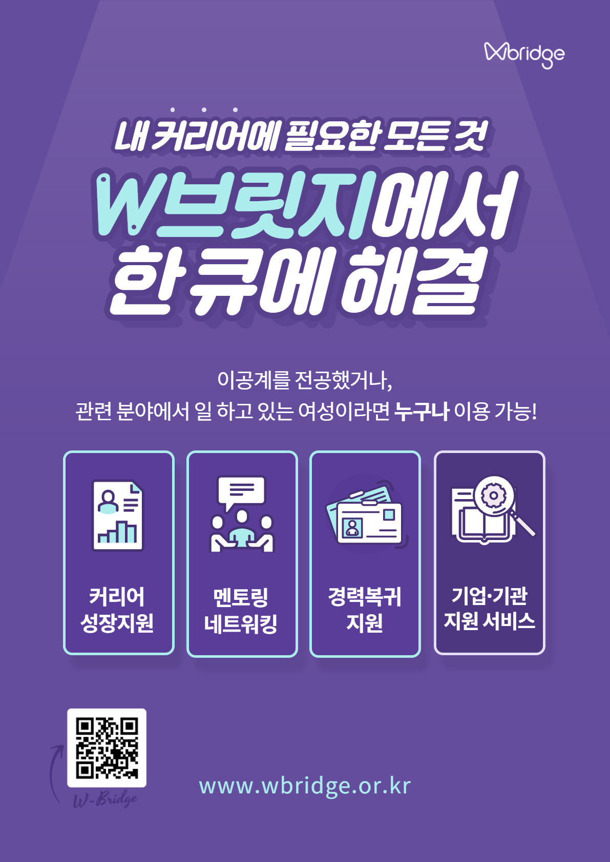 한국여성과학기술인지원센터는 이공계 여성의 진학, 취업, 성장, 은퇴 후까지 모든 생애주기의 경력 성장을 지원하고자여성과학기술인 생애주기 성장 플렛폼 '\브릿지'를 구축, 개시하였습니다. 많은 분들의 활용 부탁드립니다.