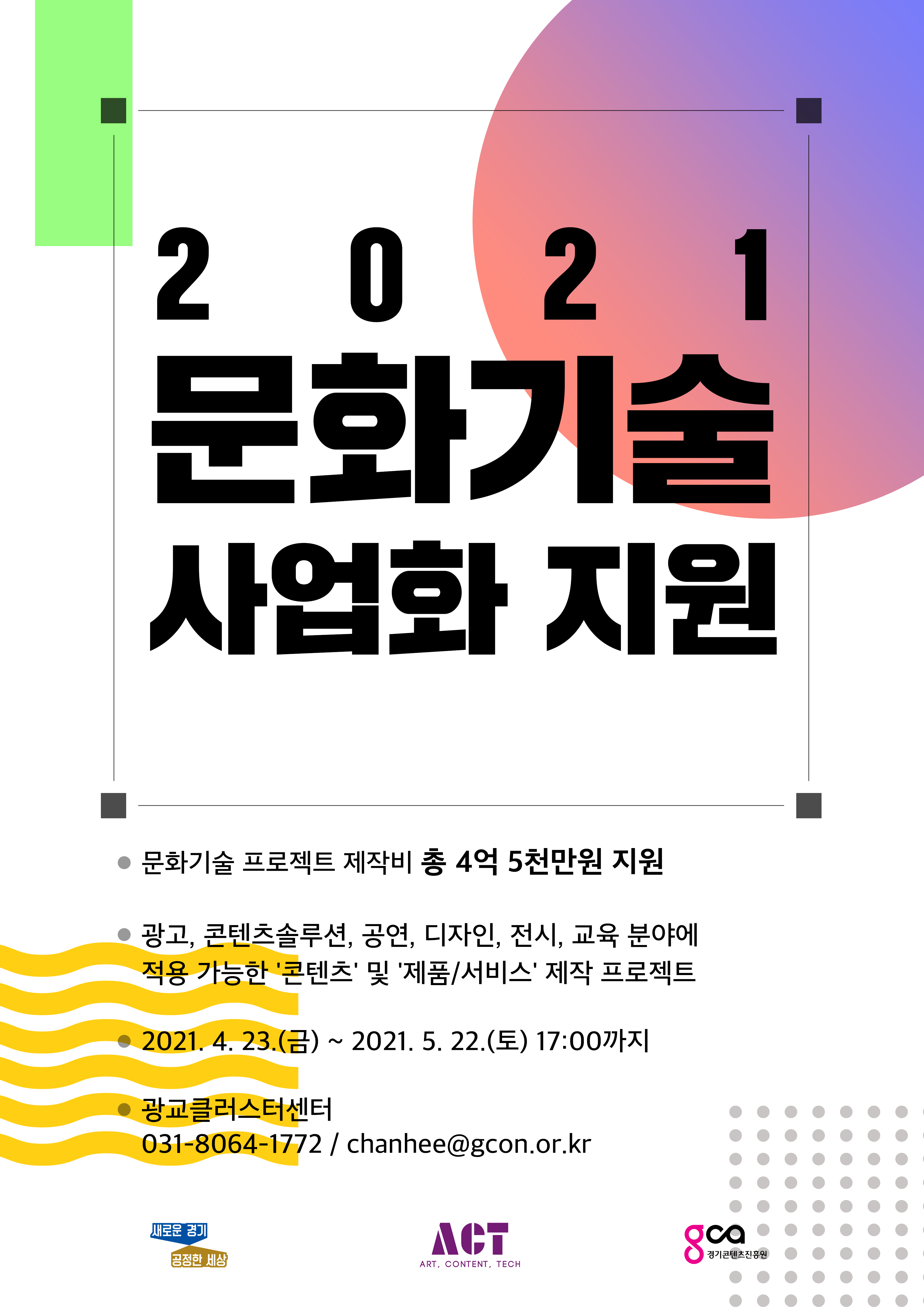경기콘텐츠진흥원에서는 문화기술 프로젝트 사업화를 위한 「2021년 문화기술 사업화 지원」 지원기업을 모집하고 있습니다. 많은 협조 부탁드립니다.