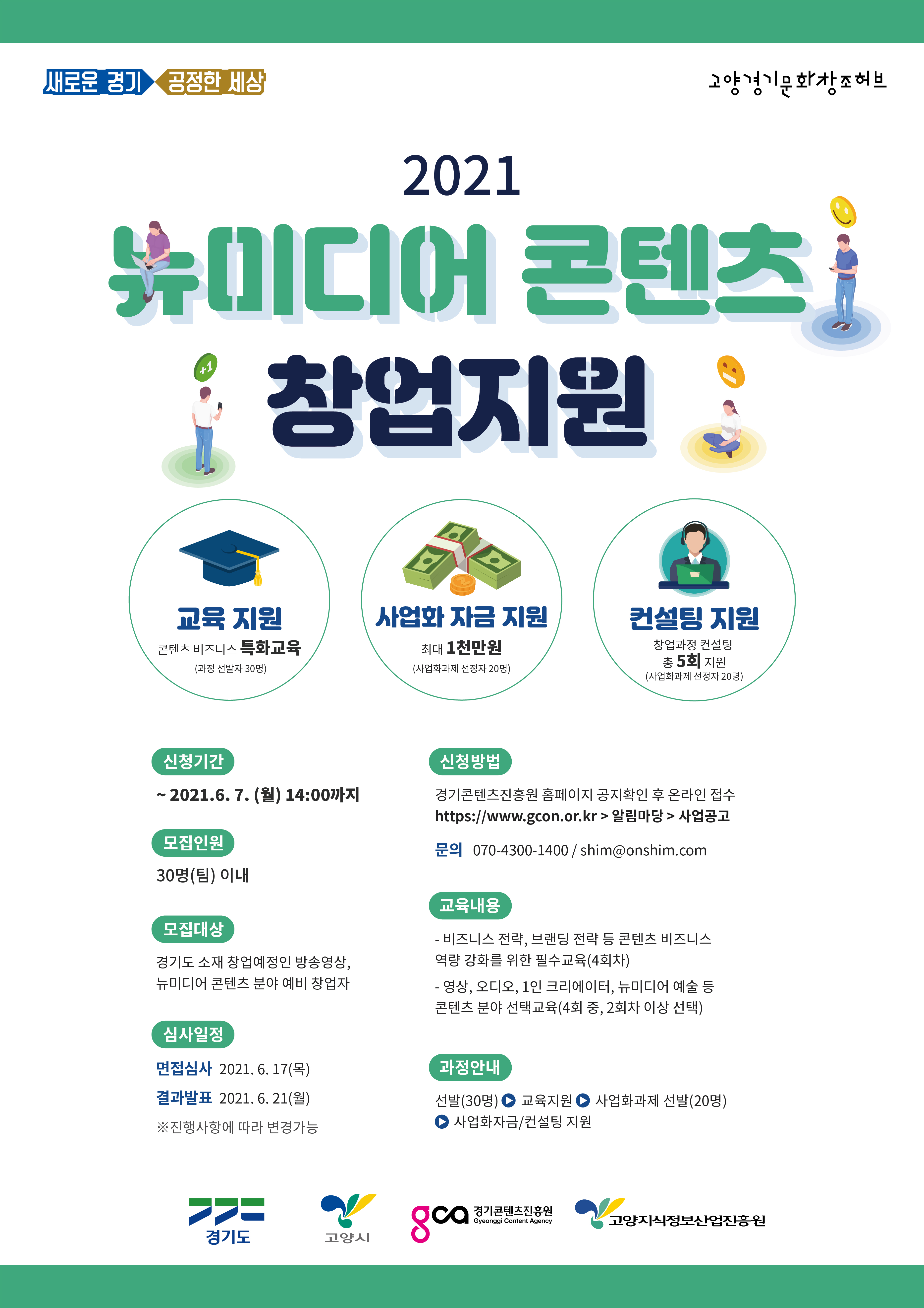 경기콘텐츠진흥원의 콘텐츠 산업 창업 지원 센터인 고양경기문화창조허브에서는 ‘2021년 뉴미디어 콘텐츠 창업지원’ 예비창업자를 모집 중에 있습니다.