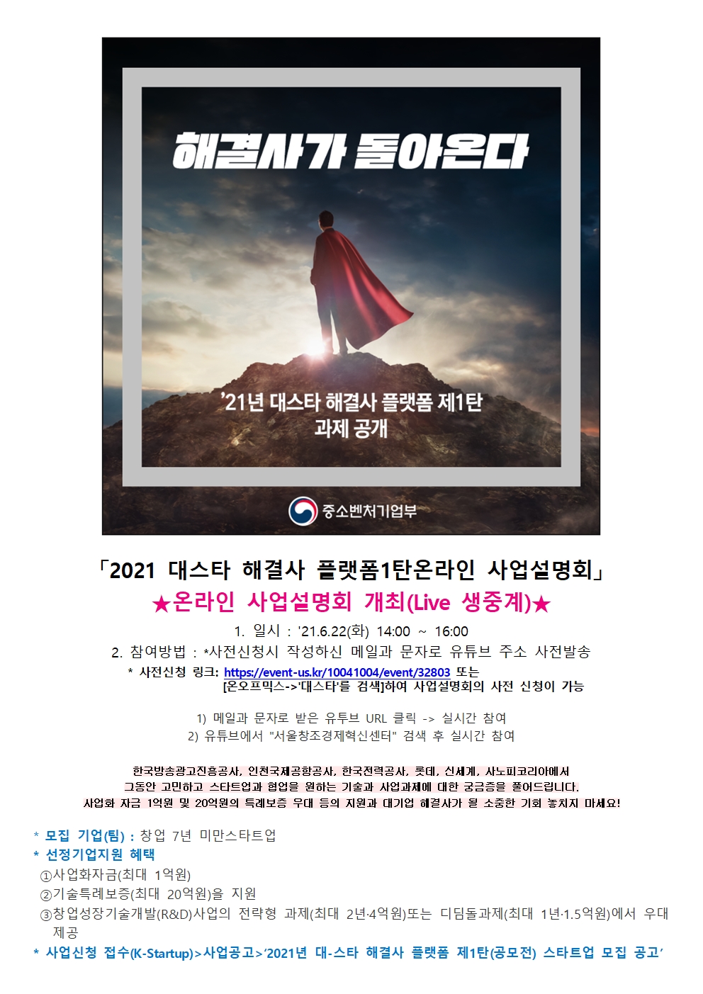 2021년 대스타 해결사 플랫폼 스타트업 모집 및 사업설명회 안내