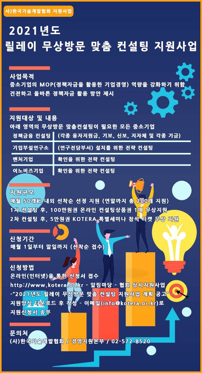 한국기술개발협회는 “2021년도 정책자금 릴레이 무상방문 맞춤 컨설팅 지원사업”을 통해 중소기업의 MOP (Management of Policyfund ; 정책자금을 활용한 기업경영) 역량 강화하고, 건전하고 올바른 정책자금 활용 방안을 제시하기 위하여 동 지원 사업 계획을 아래와 같이 공고하니 중소기업의 많은 참여를 바랍니다.