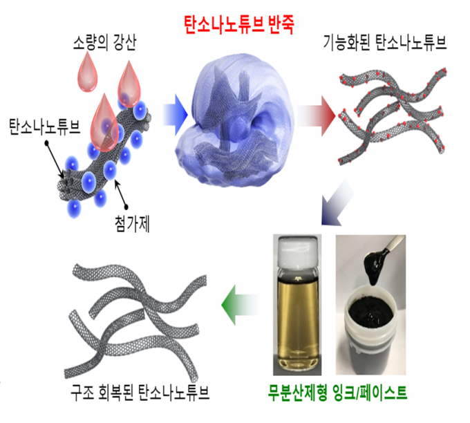 연구팀은 빵이나 국수를 만들 때 밀가루에 물과 여러 식재료를 넣고 반죽을 한 뒤 숙성을 하는 과정에서 영감을 얻었다. 탄소나노소재 분말에 소량의 강산과 첨가제를 넣고 반죽한 다음, 상온에서 일정 시간 보관하는 것이다.