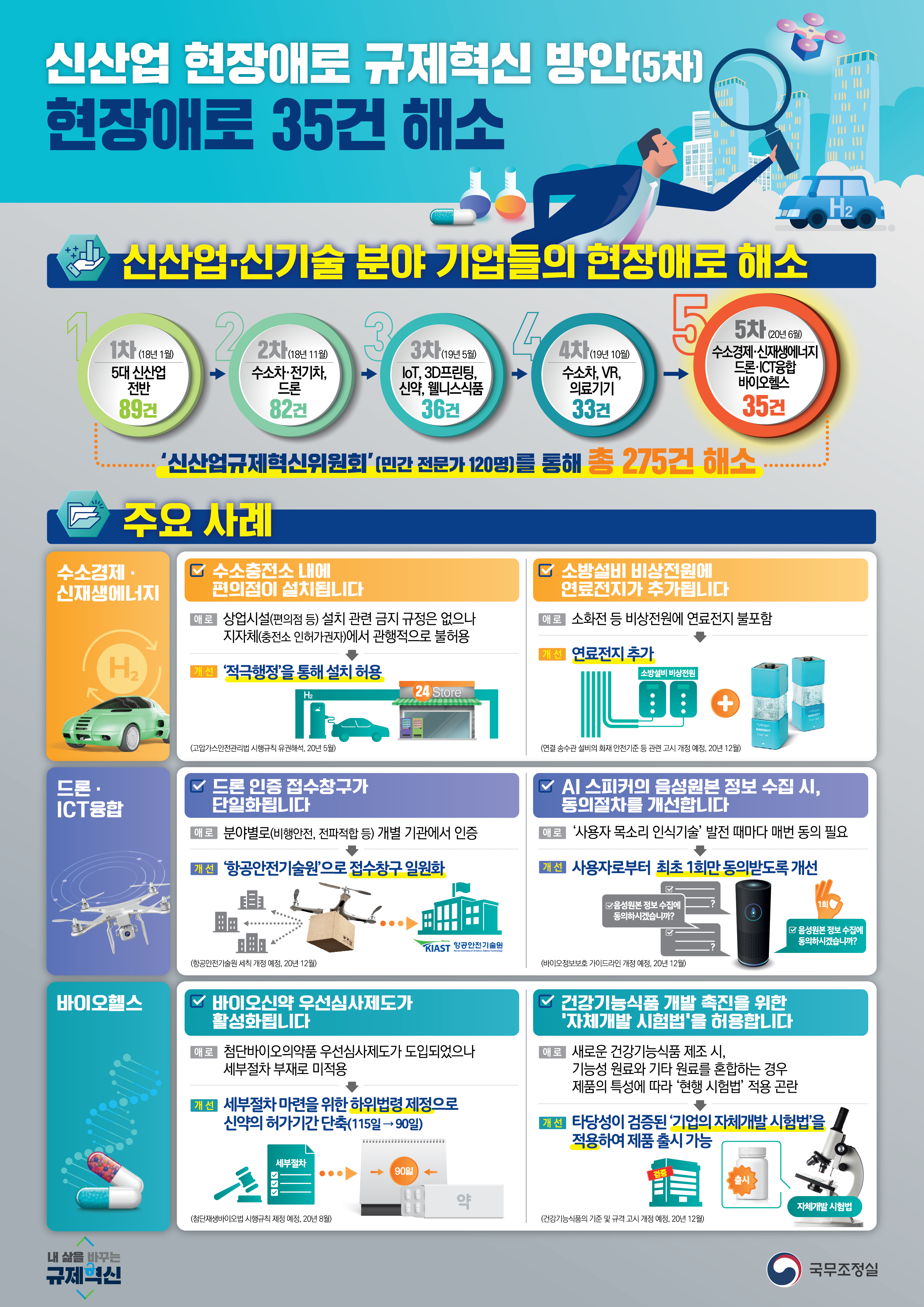 ‣△수소충전소 내 편의점 설치 허용, △소방설비 비상전원에 연료전지 추가, △드론 인증절차 간소화, △바이오신약 우선심사제도 활성화 등 애로 개선