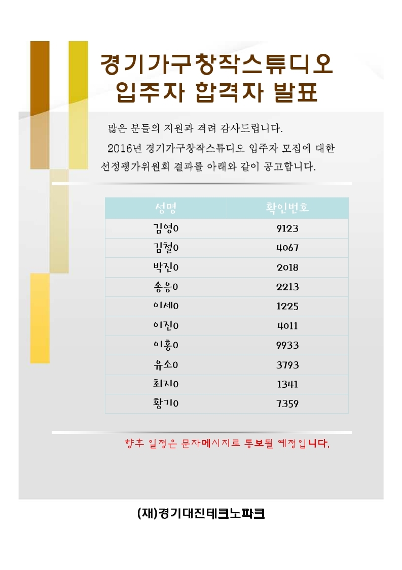 경기가구창작스튜디오 입주자 모집 합격자 공고