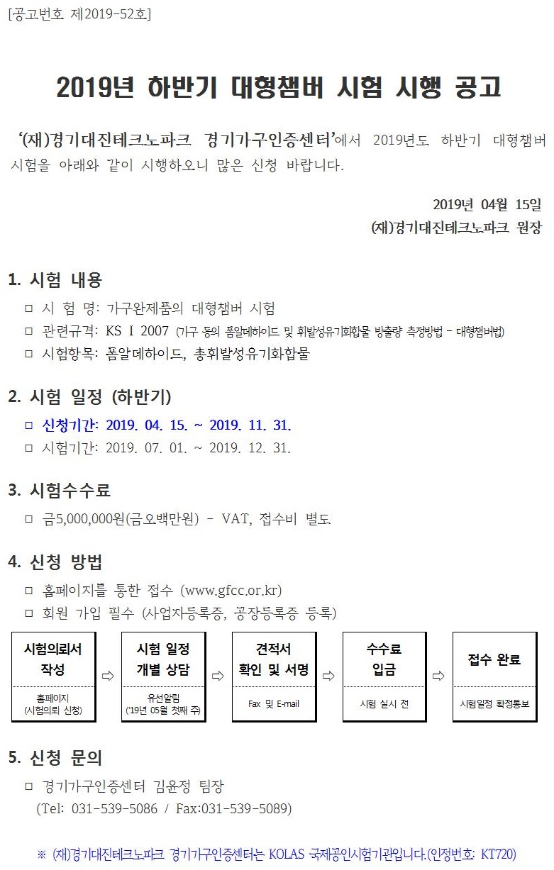 사업공고 경기가구인증센터 2019년 하반기 대형챔버 시험시행 공고 경기대진TP 19-04-12 1,356 Print 공고일 2019-04-15 ~ 2019-12-31 공고상태 마감 검색목록 이전글 다음글 목록
