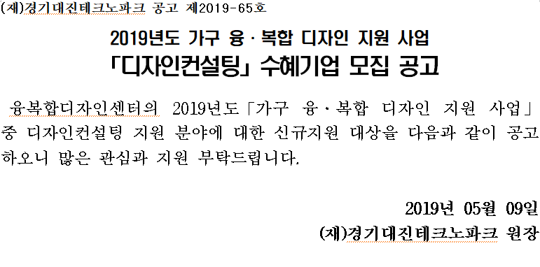 사업공고 2019년도 가구 융복합 디자인 지원 사업 디자인컨설팅 수혜기업 모집 공고 경기대진TP 19-05-09 1,328 Print 공고일 2019-05-09 ~ 2019-05-24 공고상태 마감 검색목록 이전글 다음글 목록