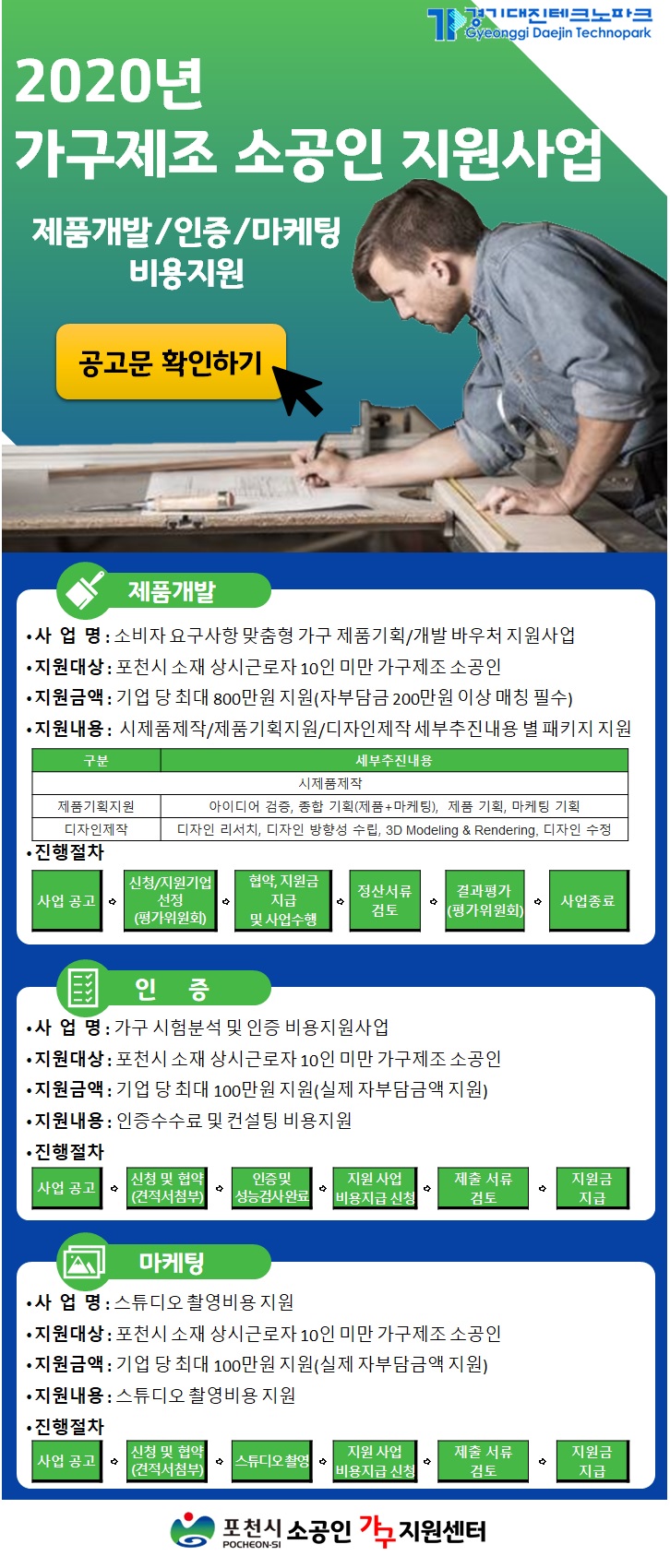 사업공고 2020년 포천시소공인가구지원센터 가구제조 소공인 지원사업 통합 공고(수정) 경기대진TP 20-04-29 4,118 Print 공고일 2020-05-01 ~ 2020-11-30 공고상태 마감 (재)경기대진테크노파크 공고 제2020-53호 「2020년 도시형 소공인 집적지구지정 및 인프라 구축사업」 가구제조 소공인 지원사업 통합 공고 (재)경기대진테크노파크 포천시소공인가구지원센터에서는 「2020년 도시형 소공인 집적지구지정 및 인프라 구축사업」을 통해 가구제조 소공인의 안정적인 성장과 재기를 위한 지원사업을 다음과 같이 공고합니다. 2020년 5월 1일 재단법인 경기대진테크노파크 원장 이전글 다음글 목록