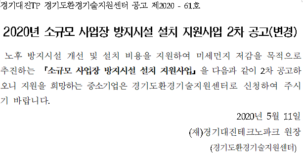 사업공고 2020년 소규모 사업장 방지시설 설치 지원사업 2차 공고(변경) 경기대진TP 20-05-08 4,102 Print 공고일 2020-05-11 ~ 2020-05-29 공고상태 마감 이전글 다음글 목록