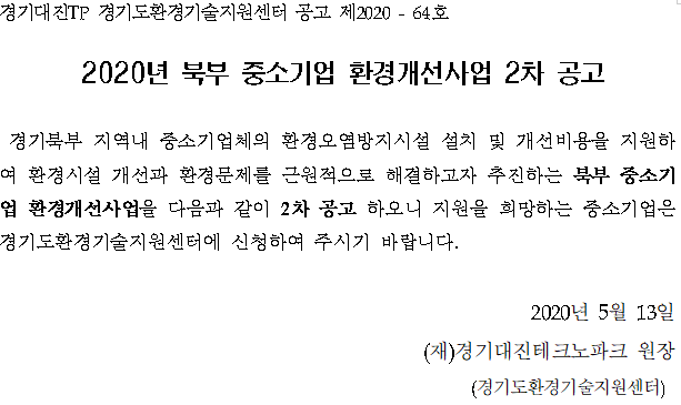 사업공고 2020년 북부 중소기업 환경개선사업 2차 공고 경기대진TP 20-05-13 4,014 Print 공고일 2020-05-13 ~ 2020-10-30 공고상태 마감 이전글 다음글 목록