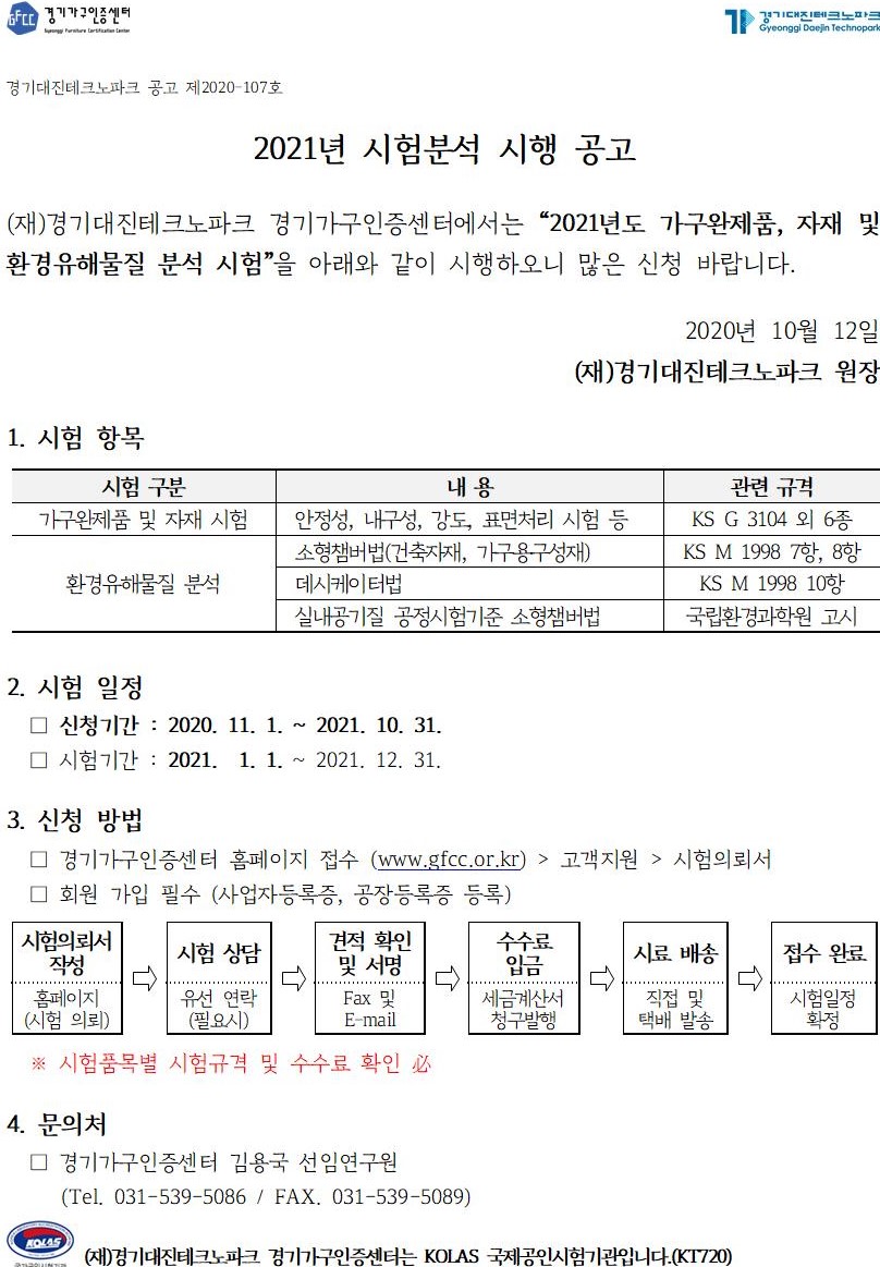 사업공고 2021년 경기가구인증센터 시험분석 시행 공고 경기대진TP 20-10-12 4,200 Print 공고일 2020-11-01 ~ 2021-10-31 공고상태 마감 이전글 다음글 목록