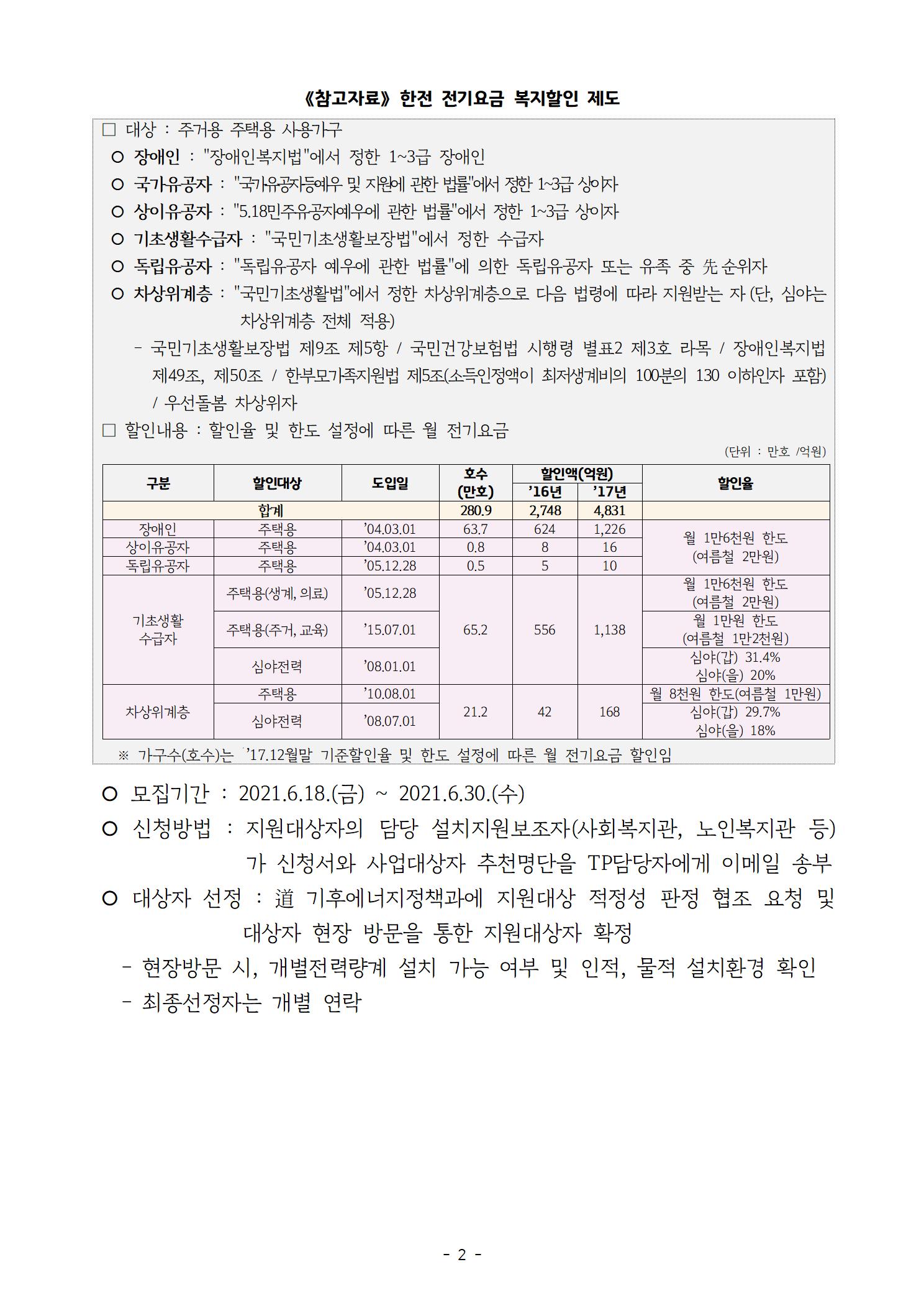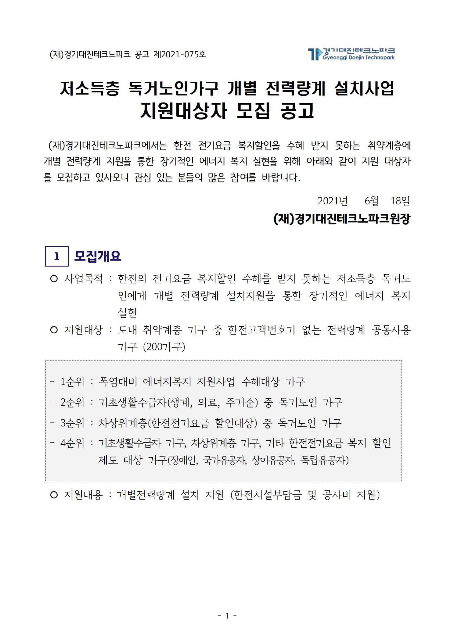 사업공고 저소득층 독거노인가구 개별 전력량계 설치사업 지원대상자 모집 공고 경기대진TP 21-06-18 4,582 Print 공고일 2021-06-18 ~ 2021-06-30 공고상태 마감 이전글 다음글 목록