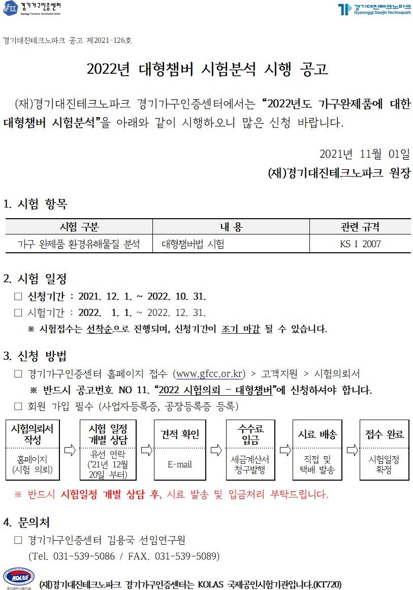 사업공고 2022년 경기가구인증센터 대형챔버 시험분석 시행 공고 경기대진TP 21-11-01 4,927 Print 공고일 2021-12-01 ~ 2022-10-31 공고상태 마감 이전글 다음글 목록