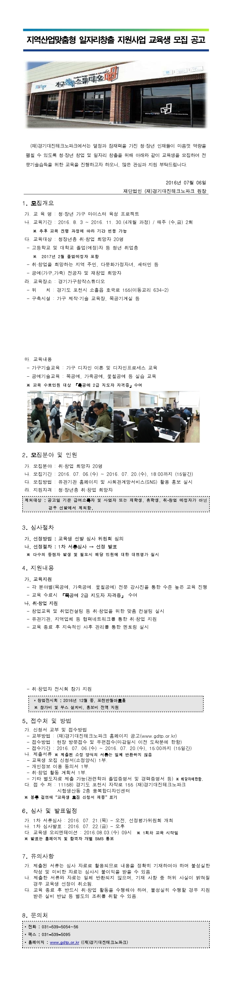 (재)경기대진테크노파크에서는 열정과 잠재력을 가진 청·장년 인재들이 마음껏 역량을 펼칠 수 있도록 청·장년 창업 및 일자리 창출을 위해 아래와 같이 교육생을 모집하여 전문기술습득을 위한 교육을 진행하고자 하오니, 많은 관심과 지원 부탁드립니다.