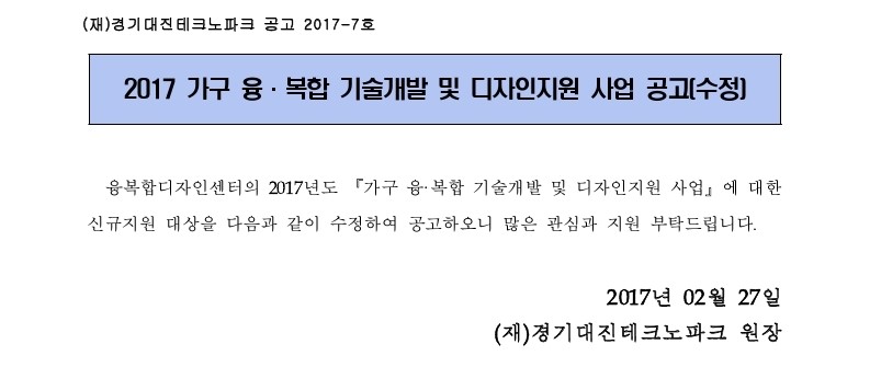 (수정공고)2017 가구 융복합 기술개발 및 디자인 지원 사업 수혜기업 모집 안내