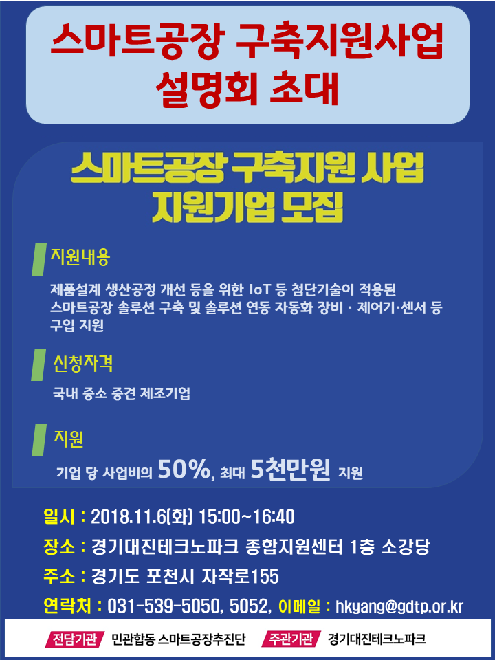 이와 관련하여 주관기관인 (재)경기대진테크노파크에서는 '스마트공장 구축지원사업 설명회'를 개최하오니 품질개선 및 비용절감을 통한 기업의 생산성 향상 및 부가가치 창출에 도움이 되는 본 사업에 관심있으신 기업체 관계자분께서는 많이 참석하여 주시기 바랍니다.
