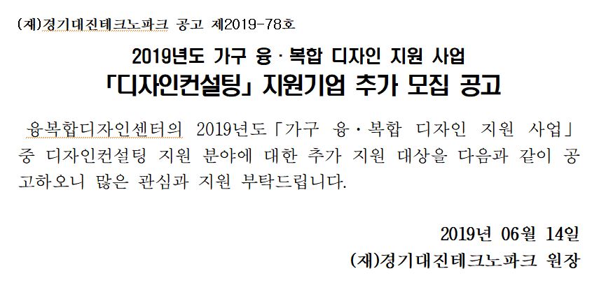 사업공고 2019년도 가구 융복합 디자인 지원 사업 디자인컨설팅 지원기업 추가 모집 공고 경기대진TP 19-06-14 3,906 Print 공고일 2019-06-14 ~ 2019-06-21 공고상태 마감 이전글 다음글 목록